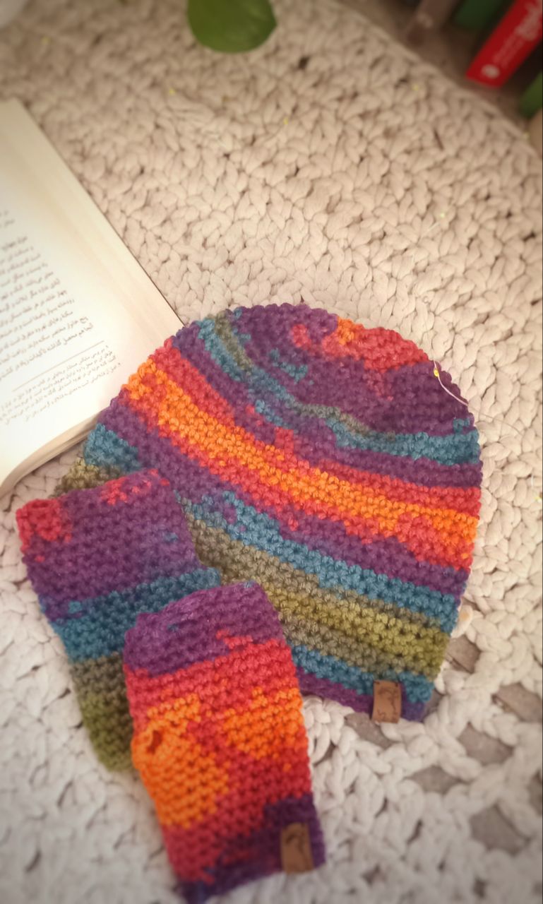 این کلاه و دستکش از کاموای چند رنگ ترک بافته شده و جابه جایی رنگها در بافت جدید اجتناب ناپذیر است. رنگ و شکل کلی کلاه تقریبا به صورتی که میبینید تحویل داده میشود.